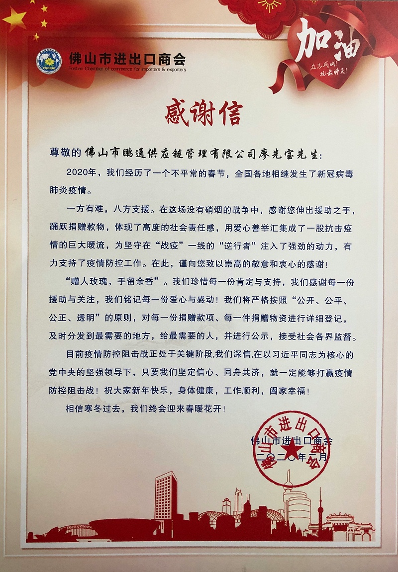 “众志成城,共克时艰”在此特殊时刻,IOS/Android通用版/手机APP下载董事长廖先宝向佛山进出口商会踊跃捐赠款物,并收到商会的感谢信。